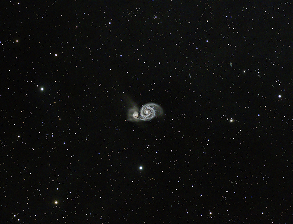 Messier 51 is located near the Big Dipper and the yellow smudge is another galaxy called NGC 5195. This galaxy is passing behind M51 and the effect can be seen as the nearby arm is stretched. This is an interesting interaction!